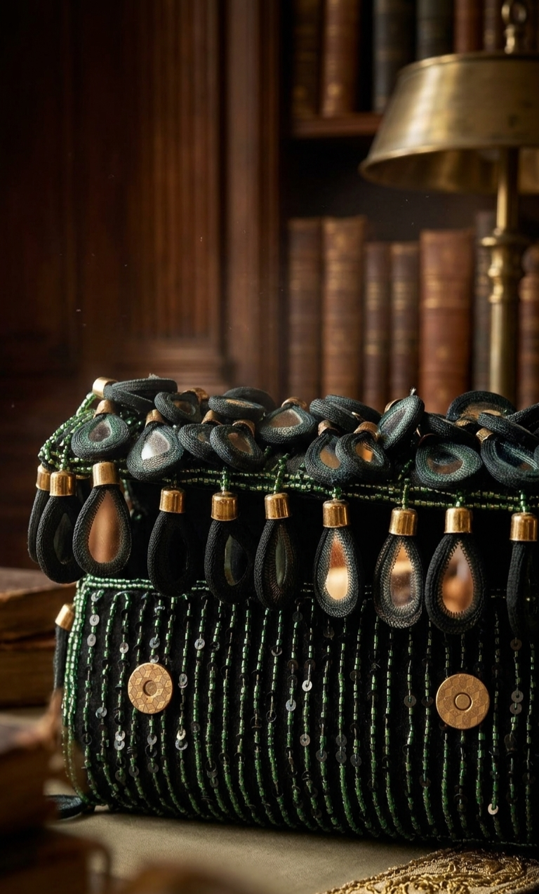Turn every entrance into a moment with this striking green statement bag, beautifully designed with cascading mirror-drop tassels and intricate hand-beaded detailing. The rich green base is elevated with reflective accents and gold-toned highlights, creating a look that feels bold, festive, and luxuriously dramatic.